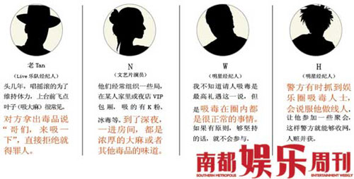 一個(gè)手底下帶著以曲藝形式包裝的Live樂隊(duì)的經(jīng)紀(jì)人老Tan對(duì)本報(bào)記者透露,自己也曾遇到過(guò)這種情況,對(duì)方拿出毒品說(shuō)“哥們,來(lái)吸一下”,這個(gè)時(shí)候,如果你不夠圓滑,直接拒絕就可能得罪對(duì)方。“如果我走進(jìn)包房,聞到有什么異樣的味道,我就會(huì)待一會(huì)兒,趕緊走。如果真躲不過(guò)被對(duì)方問(wèn)到,我也會(huì)找個(gè)理由,比如上廁所或者其他什么的,溜掉。肯定不能讓對(duì)方覺得我不把他當(dāng)哥們。當(dāng)然,這也是一時(shí)之計(jì),時(shí)間長(zhǎng)了,人家也知道你不好這口,干脆就不帶你玩兒了。” 也有某經(jīng)紀(jì)人W說(shuō):“我不知道請(qǐng)人吸毒是最高禮遇這一說(shuō),但是吸毒在圈內(nèi)都是很正常的事情。如果有原則,夠堅(jiān)持的話,就不會(huì)參與。我看見有人吸,也會(huì)勸勸對(duì)方別沾這個(gè)。不過(guò)圈內(nèi)最正常的玩法還是喝酒和泡妞。”