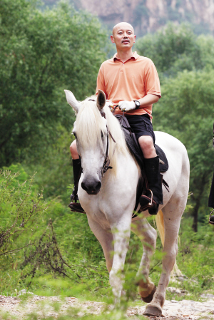 練騎馬是《讓子彈飛》演員的必修課。前段時間,廖凡、邵兵等人已經(jīng)進(jìn)組練習(xí)“馬戰(zhàn)”,現(xiàn)在終于輪到了葛大爺。葛優(yōu)的打扮十分休閑,T恤短褲輕松上陣,只是腳下長長的馬靴暴露出他還是為騎馬做了一番準(zhǔn)備的。上馬前,葛優(yōu)還對工作人員開玩笑地說,他以前騎過馬,只是現(xiàn)在生疏了。盡管教練特地挑了一匹性格溫順的白馬,但剛騎上馬背的葛優(yōu)還是顯得有些緊張。戴著白手套的雙手緊緊抓住韁繩,眼睛緊盯著地面,不敢抬頭。但很快,葛優(yōu)在一名助手、兩名教練的前后護(hù)衛(wèi)下逐漸放開膽子,催馬慢跑起來,隨著馬跑的節(jié)奏晃動身體,還有閑情抬頭看看山景,臉上也多了笑容,看來很快葛大爺就能在馬上跟姜文一決雌雄了。