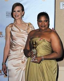 雖然妮可·基德曼近年來屢屢被冠以“票房毒藥”的惡名,但她從來都是各大頒獎禮上的耀眼之星。妮可穿了一身單肩小花白色長裙,左胸下有發(fā)散出來的垂褶。她是頒獎禮上第一個上臺頒獎的嘉賓。雖然妮可的白色單肩禮裙很美,但她一上臺就為自己沒穿黑色裙裝向海地地震的死難者默哀表示歉意,并且宣傳了網(wǎng)絡捐款渠道和喬治·克魯尼最近發(fā)起的捐款行動。