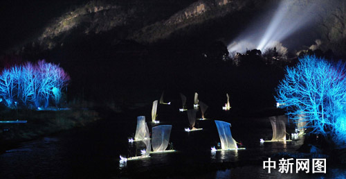 24日晚首次試演的《印象·大紅袍》實(shí)景舞臺(tái)上,在武夷山間,創(chuàng)造出180度、2公里長(zhǎng)、15塊屏幕連動(dòng)的實(shí)景立體電影,白馬一忽兒現(xiàn)身,一忽兒隱身樹(shù)林或山間,一忽兒奔騰于山那頭;仙鶴則從觀眾眼前翩翩飛走……