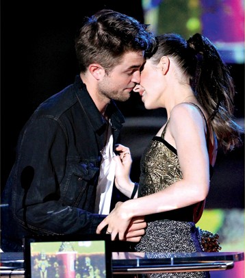 《新月》受追捧主要因?yàn)槟信惶?hào)羅伯特·帕丁森與克里斯蒂·斯圖爾特的化學(xué)作用。而在戲外,兩人也是好萊塢的一對(duì)“明星情侶”。昨日,摘得“最佳接吻”獎(jiǎng)的兩人當(dāng)場(chǎng)為在座觀(guān)眾獻(xiàn)上一吻,引來(lái)尖叫無(wú)數(shù)。