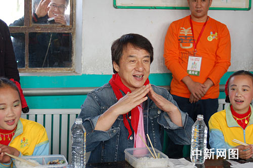 臨近午飯時(shí)分,成龍與十幾名小學(xué)童每人領(lǐng)到了一盒香菇炒油菜和白米飯的盒飯,在一間簡陋的教室里津津有味地吃了起來。雖然是頭一次與國際巨星成龍?jiān)谝黄鸪燥垼蛇@些鄉(xiāng)村娃娃卻一點(diǎn)也不怯場(chǎng),好奇心驅(qū)使他們左一個(gè)問題右一個(gè)問題問個(gè)不完。而成龍卻面帶笑容地邊吃邊聊,將他的成長經(jīng)歷和成功經(jīng)驗(yàn)?zāi)托牡匾灰唤獯稹1妼W(xué)童聽完后,紛紛夸“成龍叔叔好棒!”