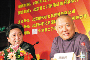 日前,“2009郭德綱圣誕喜樂(lè)會(huì)”發(fā)布會(huì)在北京舉行。郭德綱今年選擇了富力萬(wàn)麗酒店,將在可容納1000人的宴會(huì)大廳里說(shuō)相聲。對(duì)于最高8800元、最低1800元的高價(jià)票設(shè)定是否合理,郭德綱直言真正的“綱絲”10萬(wàn)元也舍得花,這說(shuō)明相聲市場(chǎng)繁榮了。