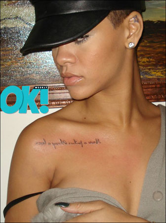 美國(guó)歌壇數(shù)一數(shù)二的潮流小天后蕾哈娜在自曝自己的手槍紋身后,再度在自己的博客中登出了全新的紋身。“Never A Failure, Always A Lesson”這就是這位小天后在自己的鎖骨處的新紋身上面的一句話?不知道蕾哈娜想要告訴我們什么呢?