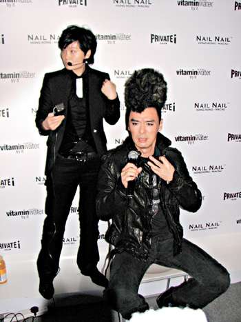中新網(wǎng)12月11日電 前晚鐘鎮(zhèn)濤和郭富城緋聞女友王秀琳等人在香港出席發(fā)型活動(dòng),為了支持活動(dòng),大家的發(fā)型都十分夸張。鐘鎮(zhèn)濤不僅頭頂巨型雞冠頭,還自曝因女友懷孕,所以自己吃生發(fā)藥來(lái)壓抑欲望。