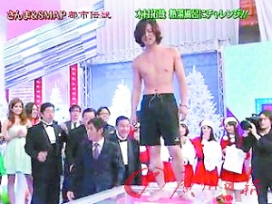 木村拓哉在錄像現(xiàn)場直接寬衣解帶,讓現(xiàn)場女性看了臉紅心跳。露出鮪魚肚的木村,心不甘情不愿地準備下水,這段“川燙木村秀”果然激出超高收視率。