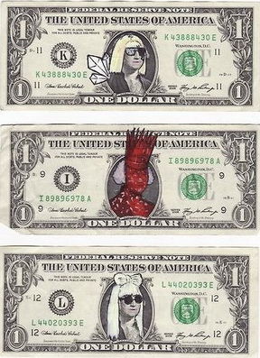 據(jù)外國(guó)媒體報(bào)道,美國(guó)流行音樂(lè)歌手、個(gè)性“舞后”lady gaga,如今可謂是紅得發(fā)紫,而她的影響力有多大?日前,美國(guó)一畫家,就將印有美國(guó)第1任總統(tǒng)喬治·華盛頓頭像的1美元鈔票,篡改成lady gaga的經(jīng)典造型。lady gaga享受到了一回和美國(guó)總統(tǒng)平起平坐的待遇。