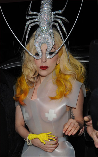 中新網(wǎng)3月2日電 “百變天后”Lady Gaga剛完成一連兩場倫敦演唱會,有傳上周五首場表演因超時(shí)45分鐘而遭場館罰款19,000美元,卻沒有阻她第二天到倫敦著名高級中菜館舉行慶功宴的興致,為了配合餐廳氣氛,她竟想到把一只銀色龍蝦放上頭當(dāng)帽戴,不知同去就餐的美國搖滾歌手Bruce Springsteen是否已經(jīng)見怪不怪。