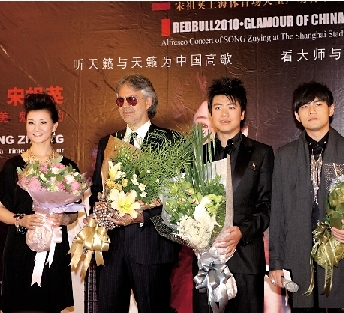 5月1日晚8點(diǎn),宋祖英將在上海體育場(chǎng)舉行大型音樂(lè)會(huì),為上海世博會(huì)喝彩。屆時(shí),宋祖英將領(lǐng)銜世界著名男高音歌唱家安德列·波切利、“鋼琴王子”郎朗、華語(yǔ)流行天王周杰倫,組成強(qiáng)大的演出陣容。昨天,這四位不同音樂(lè)領(lǐng)域的頂尖巨星一齊出席媒體見面會(huì)。圖文/本報(bào)記者 朱雅清