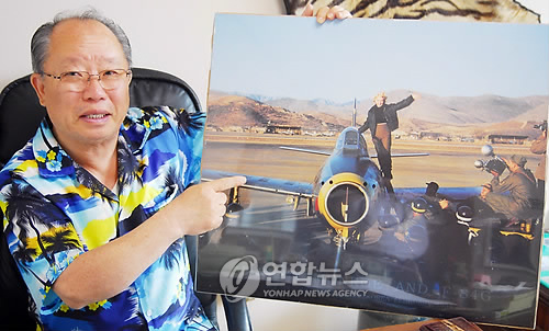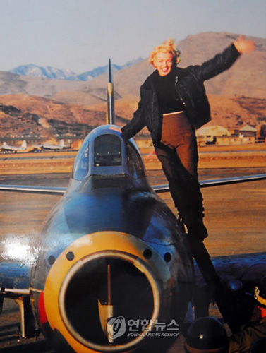 據(jù)“韓聯(lián)社”消息,照片中的夢露身穿褐色褲子和黑色航空夾克衫,她在大邱K-2機(jī)場以八公山為背景,站在“F-84G”戰(zhàn)斗機(jī)左翼上面,并高舉左臂,臉上露出燦爛的笑容。照片大小是橫67厘米,豎59厘米。