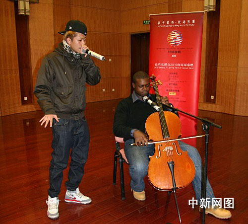 中新網(wǎng)12月10日電 昨日下午,北京電視臺《環(huán)球春晚》的排練廳迎來了兩位不同國際的特殊組合,來自美國的凱文和上海的蟲二,他們用Beat-Box這種特殊的“口技”表演為在場觀眾獻(xiàn)上了一份另類“大餐”。