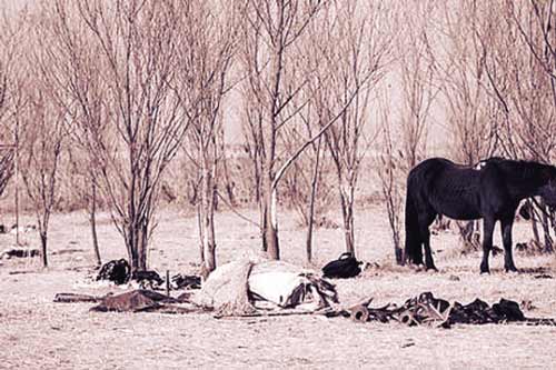 記者6日來(lái)到拍攝現(xiàn)場(chǎng),發(fā)現(xiàn)一大片平整的濕地上異常熱鬧,十多匹高頭大馬正在不停地啃著野生紅柳的樹皮,約30多臺(tái)各種車輛停放在濕地上,地上到處是垃圾和隨手扔掉的黑白塑料袋……