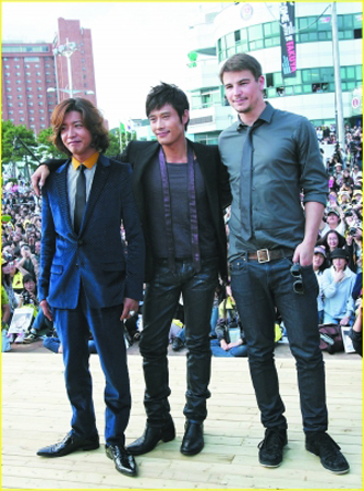 第14屆釜山影展開幕以來,喬許·哈奈特(下圖右)、李秉憲(下圖中)與木村拓哉無疑是最受矚目的3位帥哥,他們連續(xù)幾天都為新作《伴雨行》造勢。雖然木村拓哉自爆與李秉憲、喬許·哈奈特在酒店內(nèi)飲酒談心,并且他們還用了喝交杯酒的姿勢喝了很多杯。不過,有地主之利的李秉憲卻完全不顧“酒友”情,在三人同臺亮相時(shí),腳蹬近5厘米高的鞋跟,站起來硬是比號稱176厘米的木村更高一點(diǎn)。