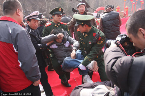 下午1時50分左右儀式開始,陳凱歌上臺發(fā)言后,在場圍觀民眾為爭看明星開始出現(xiàn)擁擠,約300民眾涌上一個高約一米、專為記者拍攝而設(shè)的木制看臺。大約三分鐘后,看臺疑不堪負(fù)重,突然倒塌。在前排拍攝的記者如滾地葫蘆般墜地,三角架、攝影機(jī)倒地?fù)p毀。在場的公安、武警將受傷的10名記者抬離現(xiàn)場,送院救治。