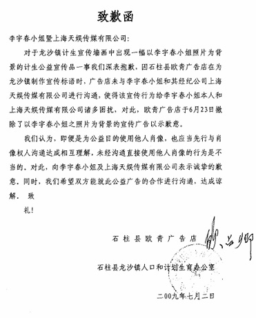 前不久有網(wǎng)友爆料李宇春的照片出現(xiàn)在了重慶市石柱縣龍沙鎮(zhèn)的計劃生育公益宣傳畫上,同時還打出“生男生女一樣好”的口號。天娛傳媒隨即指出此舉侵犯了李宇春的肖像權(quán)和名譽權(quán)。如今這張宣傳畫已經(jīng)被撤除,龍沙鎮(zhèn)人口和計劃生育辦公室還專程連同廣告公司一起向李宇春發(fā)出“致歉函”。
