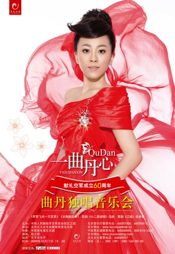 中新網(wǎng)10月12日電 為了慶祝中國人民解放軍空軍成立六十周年,空軍政治部文工團(以下簡稱:空政)獨唱演員曲丹將于本月十七日,在北京音樂廳舉行個人專場音樂會。
