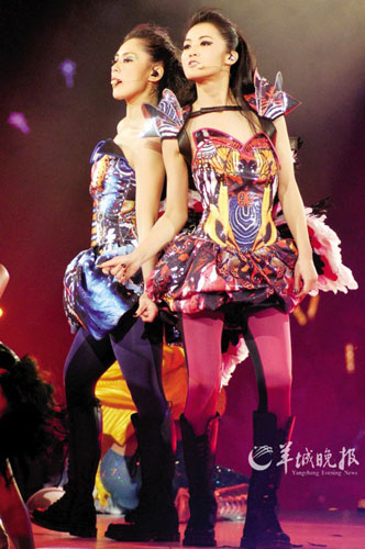 前晚的演唱會(huì)場面相當(dāng)華麗,TWINS一共換了五套華服,每套都以不同的主題場景配襯,絕對凸顯“女人味”。一開場,兩人以“冰雪女王”的科幻裝束亮相,取“破冰重出”之意;接著是“小蜜蜂”昆蟲造型,寓意“辛勤勞作望有所獲”;然后是“絢麗大花”小短裙,顯示兩人如花般“美麗綻放”;還有“芭比娃娃”俏麗打扮,取意“依然經(jīng)典可愛”;第五套服裝是夸張“鹿角”配黑白短裙,在《下一站天后》的歌聲中再次展開對“天后夢”的追逐……直到返場時(shí),她們才換回樸素的灰色短裙,裙子上印著她們此次演唱會(huì)各自的造型,似乎又回到了現(xiàn)實(shí)。