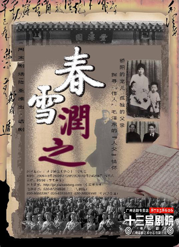 廣州話劇藝術(shù)中心董事長、該劇導(dǎo)演王筱頔表示,在以往有關(guān)毛澤東的文藝作品中,幾乎全部都是講述毛澤東在軍事和政治方面的功績,而講述毛澤東個人情感的文藝作品卻鳳毛麟角,毛澤東不僅是一位偉大的領(lǐng)袖,同時也是—位慈愛有加的父親,有著同常人一樣的舐犢之情。在慶祝建國六十周年的時候,我們謹以最真摯的感情走近開國之父毛澤東的內(nèi)心世界,撫慰那曾被人遺忘的“天涯孤旅”,領(lǐng)略人民領(lǐng)袖的愛子情懷,并從偉人教子中得到啟迪。