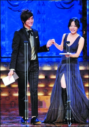 當(dāng)天,獲獎(jiǎng)的韓劇只有獲得“最優(yōu)秀青少年電視劇獎(jiǎng)”的《jungle_fish》與獲得“優(yōu)秀短篇獎(jiǎng)”的《黃金新娘》,雖然有韓星柳真和崔秀鐘擔(dān)任司儀,東方神起任表演嘉賓,還有獲得“最受歡迎男、女演員”的李準(zhǔn)基和南相美出席,但是中國明星的魅力絕對(duì)難以抵擋。蔡琳當(dāng)天以低V長裙配高筒靴的造型出現(xiàn),和小綜一起頒發(fā)“最佳男、女演員獎(jiǎng)”,小綜對(duì)蔡琳贊不絕口,還頻頻表示自己被電暈了,哄得蔡琳十分開心。而且小綜還不時(shí)用半咸淡韓語和臺(tái)下粉絲打招呼,引得粉絲們陣陣歡呼,大喊偶像的名字。