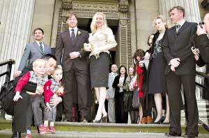 肖恩·賓原訂上個月與女演員蘇克利夫結(jié)婚,但在婚禮前24小時臨時取消,蘇克利夫當(dāng)時說,是個人因素取消婚禮。昨日在倫敦市中心舉行公證結(jié)婚前,應(yīng)邀的十多位至親好友一度擔(dān)心他們可能會再變卦,直到新人都出現(xiàn)才松了一口氣。