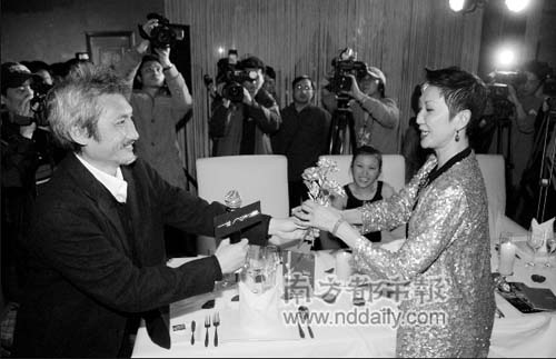 今年婦女節(jié),徐克導演的新戲《女人不壞》在北京舉辦記者會,當時四位主角向?qū)а菪炜怂蜕辖鹕倒,轉(zhuǎn)頭,徐克就將玫瑰送給了施南生,并深情地說:“金玫瑰當然要給最好的女人,你永遠是最好的女人!