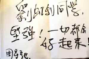 四川地震之后,不少幸存同胞心靈遭受了巨大的創(chuàng)傷,25日,記者帶著周星馳、邰正宵、張萌等明星的親筆書信來到了劉虹利的病房。當(dāng)周星馳、邰正宵等明星的親筆信交到虹利手中時(shí),她露出了多日來難得的笑容,嘴里反復(fù)說著:“真沒想到明星會(huì)給我寫信。”而周星馳正是她喜歡的電影演員之一。 胡 蓉