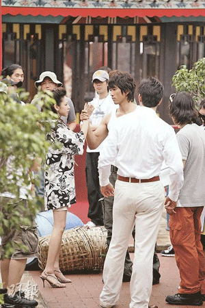 據(jù)香港《明報》報道,由于韓劇《伊甸之東》劇組要保持劇集內容的神秘,故記者采訪時要保持遠距離。不過現(xiàn)場得見,宋承憲的“掃地”裝扮也有型過人,白色背心與軍褲,展示健碩身形。而跟他有對手戲的Zoie也被其電眼電暈,不敢與他對望。