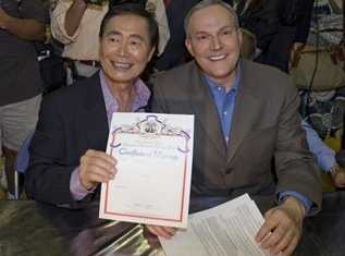 中新網(wǎng)6月18日電 加州在16日成為美國第二個允許同性戀結(jié)婚的州,17日加州各地就有數(shù)百對同性戀進行結(jié)婚登記,其中還包括曾經(jīng)演出《星際迷航》的日裔美國演員竹井喬治(George Takei),不過也有一些保守人士進行抗議,批評同性戀婚姻是種變態(tài)婚姻。