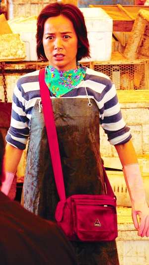 我沒覺得我在扮丑。我去體驗生活的時候發(fā)現(xiàn)那些賣海鮮的女性臉都紅撲撲的,有點像高原紅,農(nóng)村女孩子一般都會有的。我讓化妝師在臉上打上這種高原紅,還又多點了些雀斑。我本來臉上就有雀斑,更真實更生動一點吧。很多服裝也都是服裝師從當?shù)刭u海鮮的人那里收集來的。其他就沒有了。因為我本身的氣質(zhì)比較城市化一些,人家一看還覺得像個老師什么的,所以我需要自己在外形上做得比較靠近她們,否則演出來很不像。
