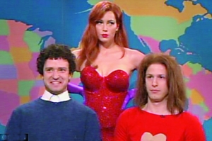 上周末,賈斯汀亮相節(jié)目《周末直播》時(shí),以四格漫畫(huà)人物Cathy老公I(xiàn)rving造型出現(xiàn)。正當(dāng)他對(duì)著安迪·薩姆伯格扮演的Cathy表白時(shí):“就算《誰(shuí)陷害了兔子羅杰》里的兔女郎出現(xiàn),我眼睛都不會(huì)眨一下。”現(xiàn)任女友杰西卡·貝爾便以該人物的性感造型現(xiàn)身,還邀請(qǐng)賈斯汀一起散步。這是兩人拍拖后首次同臺(tái)表演,令現(xiàn)場(chǎng)觀眾十分驚喜。