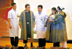 前日,由廣東省第二人民醫(yī)院(以下簡(jiǎn)稱省二院)辛苦籌備5天的“天使的愛(ài)”抗震救災(zāi)專題文藝演出在省二院禮堂舉行,全部節(jié)目幾乎都由省二院醫(yī)護(hù)工作者中的“文藝尖子兵”擔(dān)綱主演,現(xiàn)場(chǎng)表演的京劇演唱《醫(yī)患魚(yú)水情》,曲調(diào)來(lái)自《沙家浜選段》的《魚(yú)水情》,本是講“軍民魚(yú)水情”,填上新詞變成了醫(yī)患之間的諧趣唱段,如“精心護(hù)理真不差”之類,逗得現(xiàn)場(chǎng)觀眾笑逐顏開(kāi)。