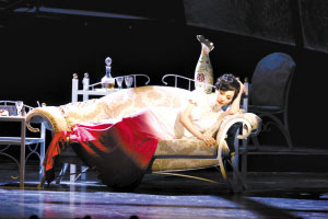 對此,導(dǎo)演王延松表示,“鳥巢”并不新鮮,倒是由一端底處逐漸盤旋上升到另一端中高處的一長段樓梯形成的“腰線”比較特別,是一個原創(chuàng)。演出中,陳白露經(jīng)常要在這段樓梯跑上跑下,為整部《日出》穿針引線。華麗場景與三等劇院的變換,也巧妙地利用了帷幔、燈光,用燈光下映襯在幔布上的演員的剪影與舞臺上演員的身影,相互呼應(yīng)、巧妙相連。