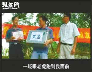 事隔4個多月后,近日“周老虎”還原真相成了紙老虎。隨后記者在斑點網(wǎng)等視頻網(wǎng)站上看到,從6月30日開始,全長27分47秒的視頻小電影《拍虎》也被傳到網(wǎng)上,片中周正龍被稱為“周震聾”,因為林業(yè)局張局長承諾“如果當?shù)卮迕裨谖覀兛疾礻犨M山之前能發(fā)現(xiàn)華南虎,我們會給一箱錢作為獎勵”,于是“周震聾”十分興奮,上山尋虎十幾天,最后與人密謀通過年畫拍出華南虎照片。全片最后表現(xiàn)“周震聾”在事情敗露后,從山崖摔下導致失憶,人也變得瘋瘋癲癲,成天抱著個假老虎模型唉聲嘆氣。