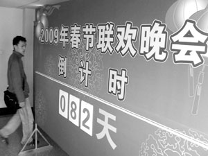 昨日記者前往位于五棵松附近的09春晚劇組,看到劇組門口已經(jīng)掛出了寫有“2009年春節(jié)聯(lián)歡晚會倒計(jì)時82天”字樣的牌子。每個進(jìn)入春晚劇組辦公室的人員,每天都必定會經(jīng)過這塊倒計(jì)時牌。
