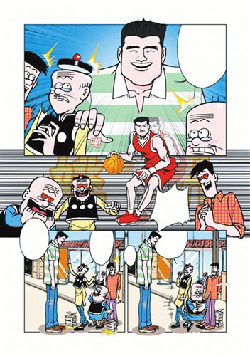 從昨日拿到的《姚明與老夫子》成品中看到,姚明的漫畫形象與其本人頗為相似,身材魁梧、留著平頭、拖著個大下巴。特別是笑起來一副憨態(tài)可掬的樣子,與熱映一時的好萊塢動漫大片《功夫熊貓》中的熊貓阿寶頗為神似。為使姚明的漫畫形象與真人形神皆似,創(chuàng)作者做了大量的前期準備工作。這部漫畫主創(chuàng)之一、廈門華祥動漫科技有限公司總策劃馬桂林告訴記者,確定姚明漫畫造型是作品成敗的關(guān)鍵,為此主創(chuàng)人員搜集了幾萬字有關(guān)姚明的材料,從工作到家庭到生活習慣應(yīng)有盡有。