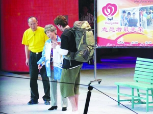 情節(jié):北京奧運(yùn)會(huì)期間,蔡明十分羨慕志愿者。她遇見了穿著志愿者服的郭達(dá),于是纏著他,要跟他一起幫助來北京的客人。兩人遇見了急著找?guī)捻n國(guó)小伙子,因?yàn)槁牪欢』镒诱f啥,折騰了半天才明白過來,直把小伙子急得捂著小腹,滿地亂跳。接著兩人遇見了迷路的美國(guó)小伙子。美國(guó)小伙子只會(huì)說簡(jiǎn)單的中文,郭達(dá)只會(huì)說Welcome to beijing這么一句外語,于是又是一陣瞎鬧騰。蔡明指手畫腳,希望用肢體語言讓小伙子明白各種地名,但越搞越亂。此時(shí),真正的志愿者上場(chǎng),原來郭達(dá)只是穿了人家晾在外面的志愿者服。蔡明、郭達(dá)失落之時(shí),遇見走失了新郎的新娘,兩人想盡辦法幫她找到了新郎,十分高興,最后大家邊為觀眾發(fā)喜糖邊退場(chǎng),喜氣十足。