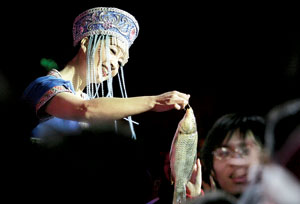 見柚子落到身邊的人手中,一位觀眾嘆著氣剛要坐下,徐鳳美身子一晃,又變出一條鮮魚送給他。意外的收獲令這位觀眾張大了嘴巴,全場響起掌聲。