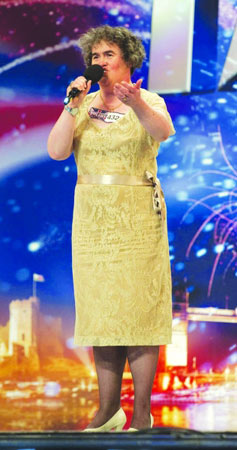 4月11日,沒有接受過任何聲樂訓(xùn)練的蘇珊走上了舞臺(tái)。聚光燈下,當(dāng)身材肥胖的她告訴現(xiàn)場(chǎng)所有人她的夢(mèng)想是成為伊蓮·佩姬(英國(guó)音樂劇女神)時(shí),包括評(píng)委在內(nèi)的所有人都狂笑不已。但當(dāng)她一開口之后,眼神立即變得柔情萬(wàn)種,歌聲中具備了驚人的爆發(fā)力與磁性……從那時(shí)起,先前的笑聲戛然而止,現(xiàn)場(chǎng)除了掌聲便是尖叫!一曲唱罷,觀眾們紛紛起立熱烈鼓掌,幾個(gè)歲數(shù)很大的觀眾偷偷用手擦去感動(dòng)的眼淚。評(píng)委之一的西蒙驚訝得張大了嘴巴;評(píng)委皮爾斯·摩根更直呼:“現(xiàn)在沒人笑你了,你的表演震撼、無與倫比!而你更是我們這個(gè)節(jié)目開辦三年來最大的驚喜!”