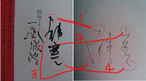 此外,該網(wǎng)友還拿出親自排隊(duì)得到的韓寒親筆簽名及網(wǎng)友貼的從韓寒淘寶店買來的簽名,分析其筆跡,該網(wǎng)友斷言,韓寒賣書的簽名都是韓爸爸或其他人代簽的。
