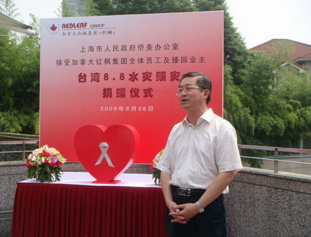 8月26日上午,上海市政府僑辦接受加拿大紅楓集團(tuán)向臺(tái)灣受災(zāi)地區(qū)捐贈(zèng)儀式在臻園別墅舉行。加拿大紅楓集團(tuán)董事長(zhǎng)周正寬先生、馬絢華女士代表集團(tuán),通過上海市政府僑辦向臺(tái)灣受災(zāi)地區(qū)捐款人民幣30萬元。副總經(jīng)理丁道恒等代表全體員工捐款人民幣1.7余萬元。臻園別墅業(yè)主也在活動(dòng)現(xiàn)場(chǎng)進(jìn)行了捐款。上海市政府僑辦主任崔明華出席活動(dòng)并講話。