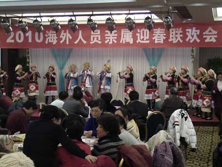 由澳洲海外親屬自行排演的15人的葫蘆絲演奏拉開(kāi)文藝節(jié)目演出的帷幕。精彩的節(jié)目給觀眾以美好的藝術(shù)享受。演出期間還穿插了各片區(qū)海外親屬會(huì)員集體對(duì)海外游子的美好祝福。20個(gè)形式多樣的文藝節(jié)目全部由海外親屬自排自演,充分展示了他們的才華。