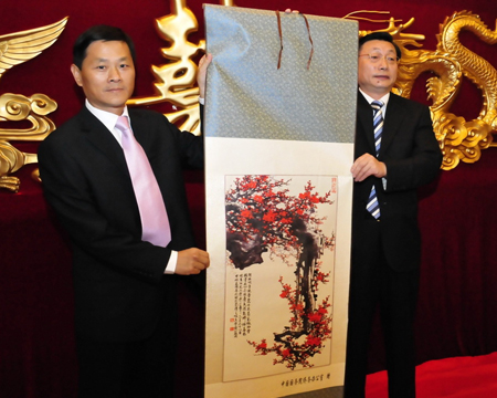 宴會(huì)中,國(guó)僑辦副主任馬儒沛向華人協(xié)會(huì)贈(zèng)送了字畫(huà)。