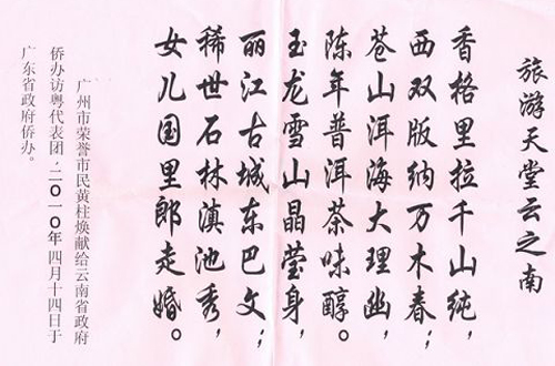中新網(wǎng)4月16日電 據(jù)云南省僑辦網(wǎng)站消息,4月14日,云南省僑辦副主任張新明一行到廣州舉辦第八屆東盟華商會項目推介,受到廣東省僑辦及廣東省僑商會熱烈歡迎。廣州市榮譽(yù)市名、廣東省僑商會常務(wù)理事黃柱煥先生特賦詩一首。