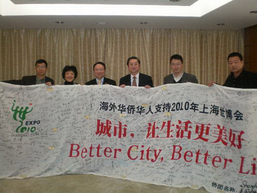 蘇彥韜向崔明華介紹了該會和他所任總裁的鷹龍傳媒集團(tuán)在近年大力宣傳上海世博會的情況。據(jù)悉,該會前后共舉辦了7次世博旗簽名活動(dòng),每次都吸引了成千上萬人參加,有力地提高了上海世博會在洛杉磯地區(qū)的影響。周琴介紹說,有位行動(dòng)不便的僑胞興奮地在簽名旗上寫下了自己的姓名,并欣慰地說:“我去不了,就讓我的名字去吧!”。