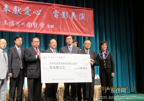中新網(wǎng)5月6日電 據(jù)廣東僑網(wǎng)消息,5月3日,香港僑界社團聯(lián)會舉行“情系玉樹 奉獻愛心 電影義演”暨向玉樹地震災區(qū)捐款儀式,廣東省僑辦主任吳銳成應邀出席并講話。