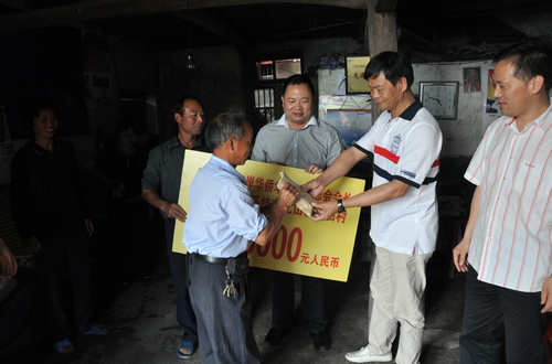 楊雷、朱有民一行人先后來(lái)到兩村,跟村兩委人員親切交談,了解村里的基本情況。肖山村全村800多人,有160多人留守在家,村民們主要收入來(lái)源就是稻田養(yǎng)魚(yú)和油茶培育。而泉山村全村也就70多戶(hù)村民,經(jīng)濟(jì)來(lái)源單一,生活生產(chǎn)困難。座談會(huì)上,村干部們就如何發(fā)展該村經(jīng)濟(jì)效益而暢所欲言,同時(shí)也提出了由于地處偏遠(yuǎn),經(jīng)濟(jì)發(fā)展不起來(lái),資金不足而導(dǎo)致至今沒(méi)有一幢像樣的村委大樓等困難和問(wèn)題。朱有民在了解情況后,毫不猶疑地向兩村各捐贈(zèng)了3萬(wàn)元人民幣,用于村委大樓的建設(shè),并表示以后村里如果有問(wèn)題和困難,他都會(huì)一直關(guān)注和支持的。