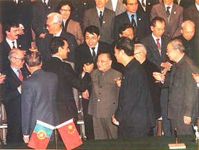 中共中央顧問委員會主任鄧小平與葡萄牙總理席爾瓦共同舉杯,慶賀中葡聯(lián)合聲明的簽署。