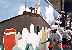 圖片說明: 澳門兒童在街頭工地圍板上繪出城市風光,以美化環(huán)境。