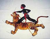 由于這種藝術(shù)歷史悠久,源遠(yuǎn)流長,所以其流傳范圍極廣,名稱也不同;因其演員只有一人,故南方各省稱之為“單人班”;因表演時人藏在布帷之中,故四川省稱之為“被單戲”;又因以扁擔(dān)挑道具并支撐臨時搭起的小戲臺,故在河北吳橋等地稱為“扁擔(dān)戲”。有關(guān)傀儡戲的表演方式及特點(diǎn),可見《揚(yáng)州畫舫錄》中一段記載:“圍布作房,支以一木,以五指運(yùn)三寸傀儡,金鼓喧鬧,詞、白皆用叫嗓子,均一人為之,謂之扁擔(dān)戲!