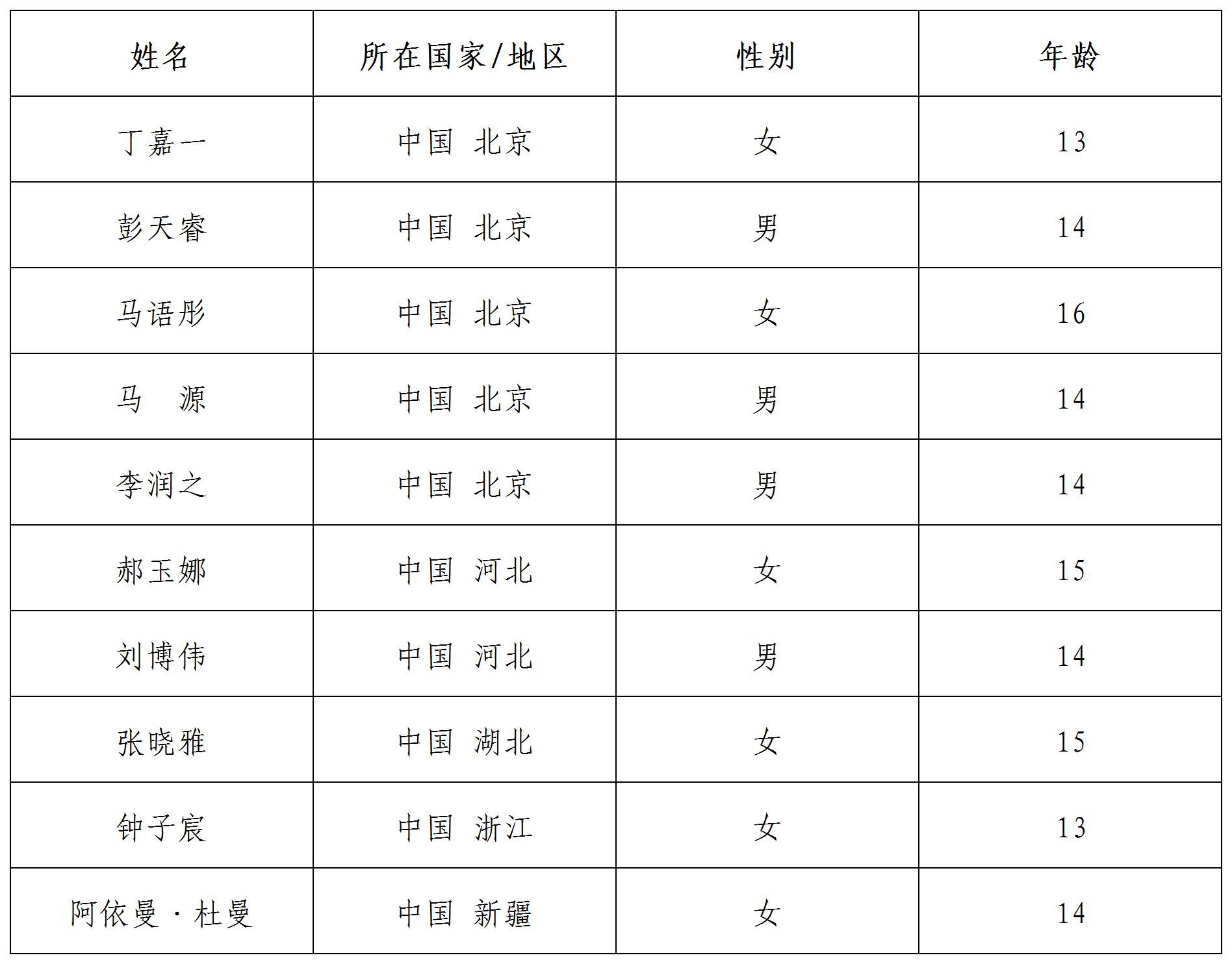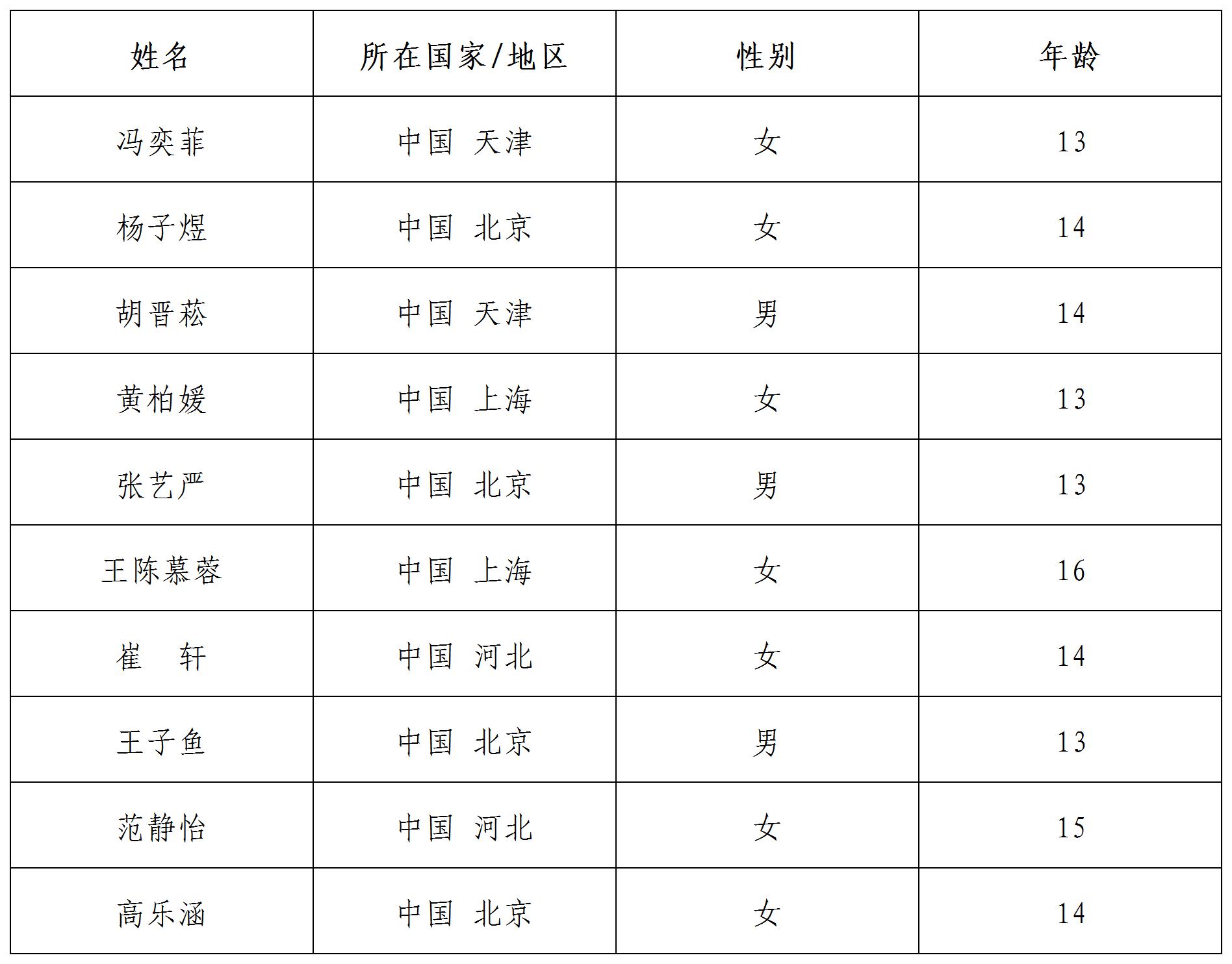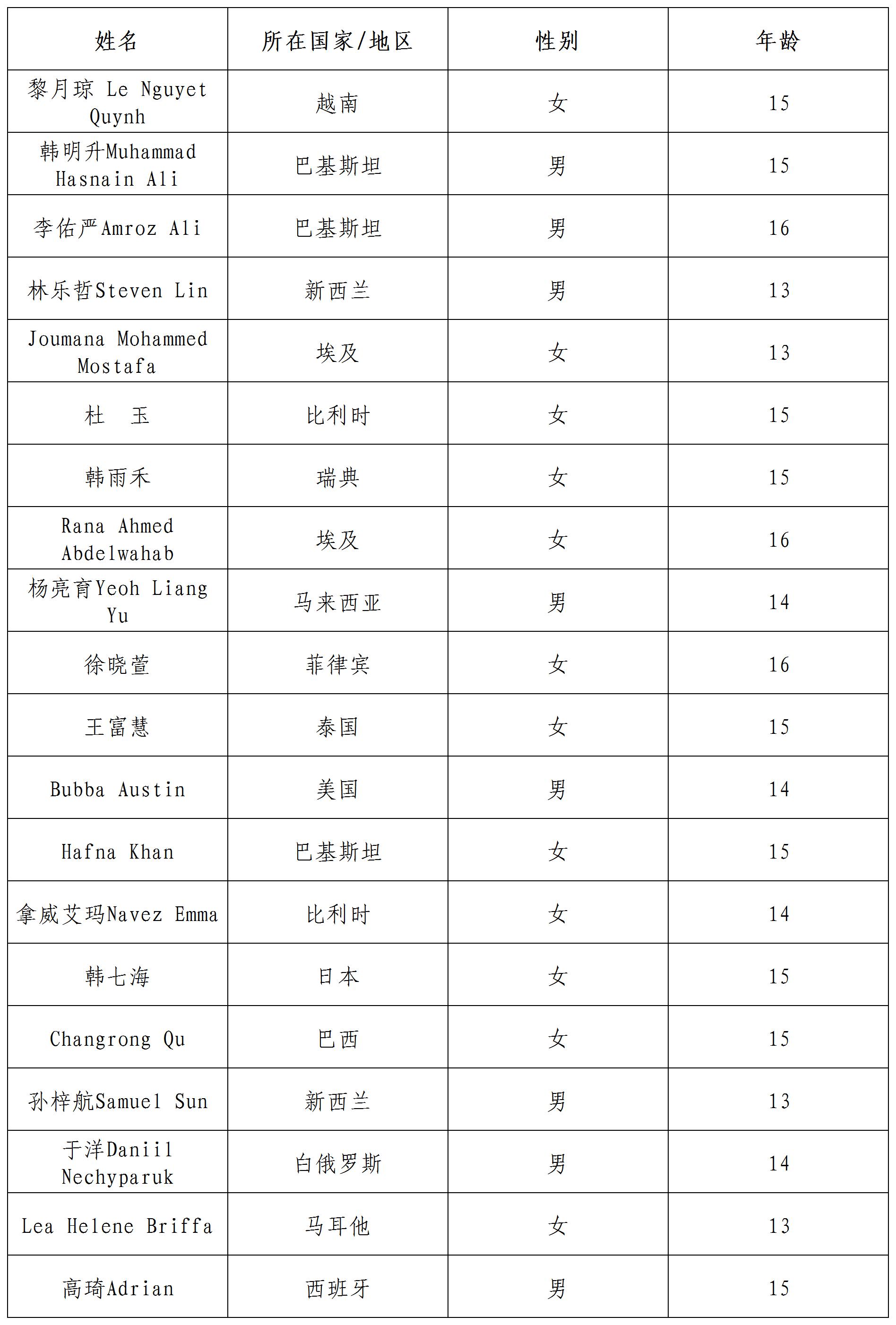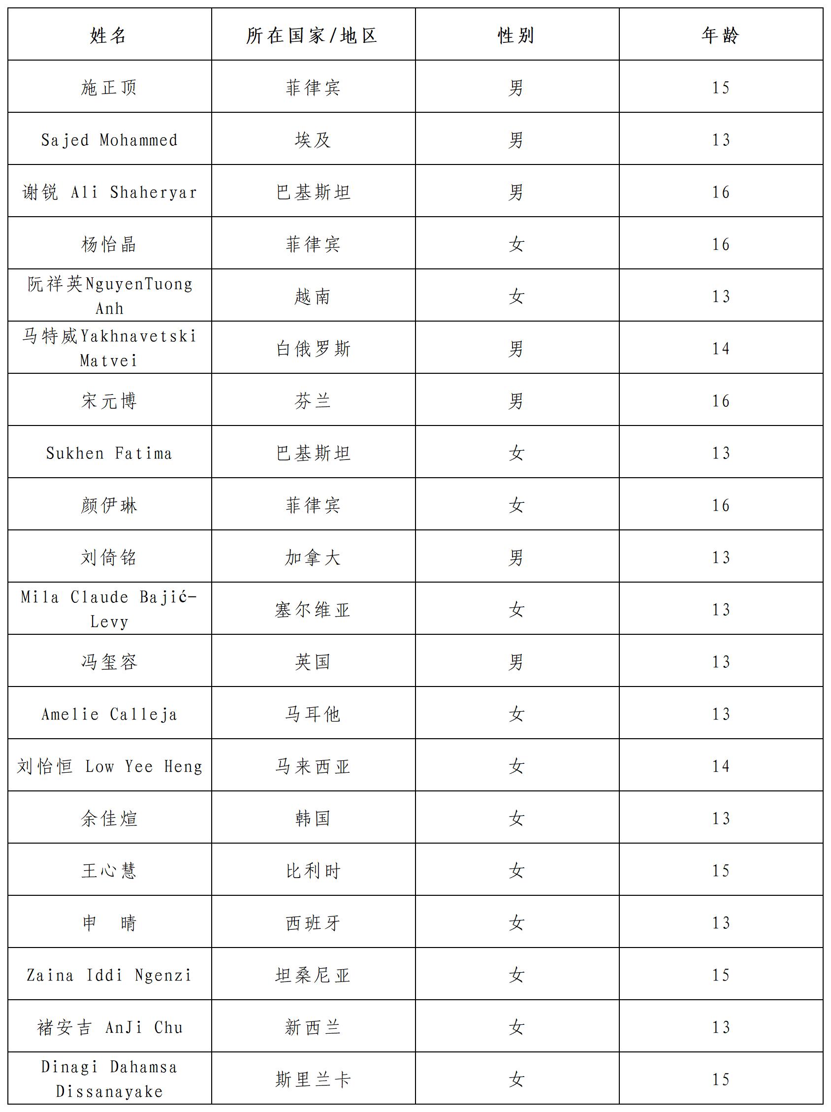 公示時(shí)間:即日起至2022年2月1日北京時(shí)間24:00 咨詢方式: 郵箱:yszxhd@sclc2017.org 聯(lián)系電話:15810563423 如有異議,請于公示期間致電或郵件咨詢。本活動最終解釋權(quán)歸中國宋慶齡青少年科技文化交流中心所有。 備注:標(biāo)注國家以參與者報(bào)名時(shí)駐在國為準(zhǔn)。